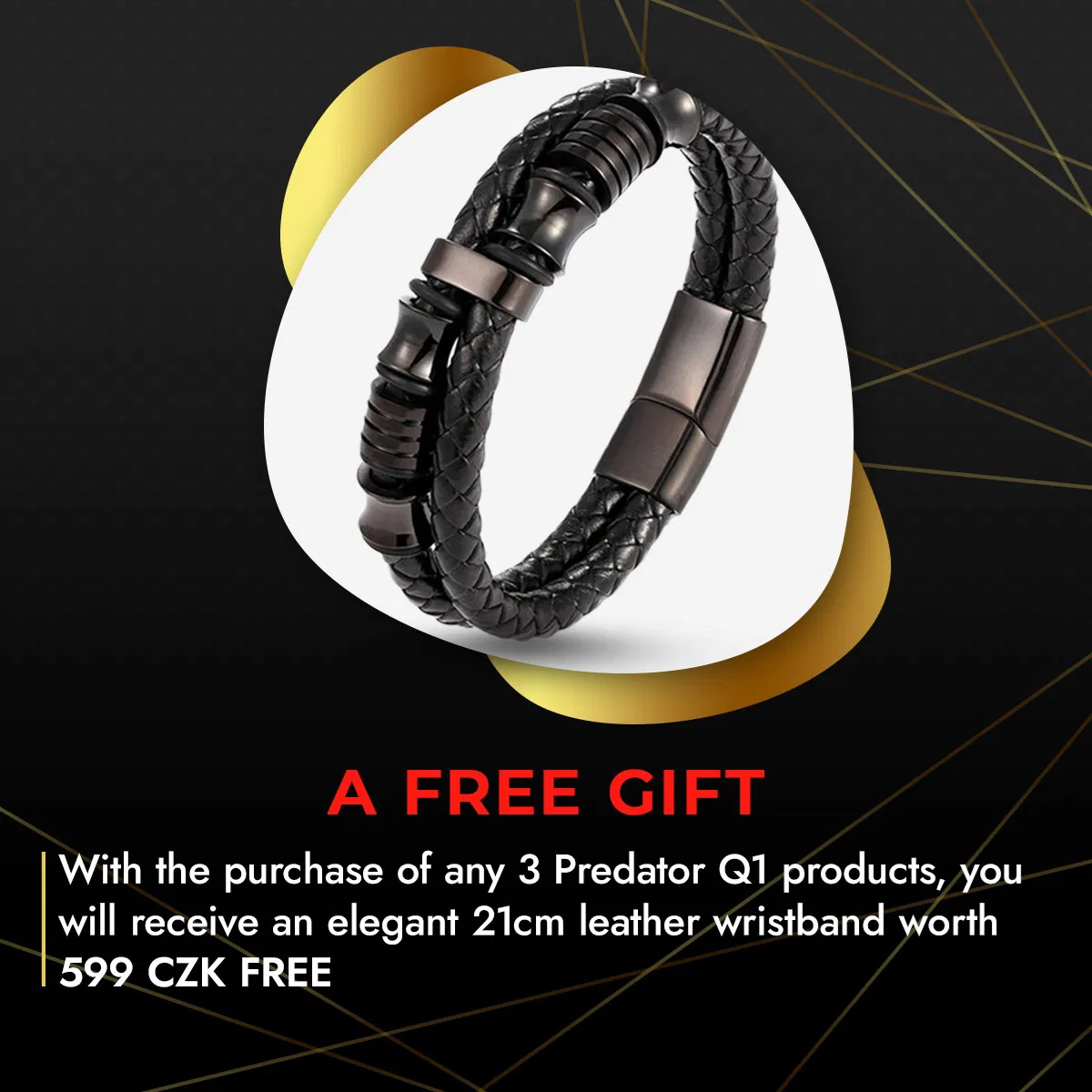 Při nákupu libovolných 3 produktů značky Predator Q1 od nás získáte jako dárek elegantní kožený náramek o délce 21 cm v hodnotě 599 Kč zcela ZDARMA.
